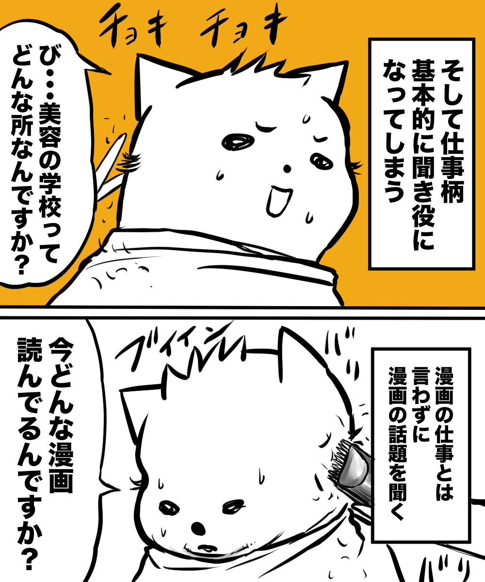 2023年02月26日 人と喋りにあの場所へ・・・ コミュ障ってわけでは無いのですが、人と喋るのに物凄くエネルギーを使ってしまうタイプなのでなかなか積極的には話しかける事がないうえにアシスタント時代はずっと篭りがちで、基本的にお家好き好きだったので本当仕事関係以外の知り合いが増えませんでした😂まぁ、最初は全然平気だったんですけどね(笑) でも段々と不安に思う事が増えてきて、そんな時は美容室に行ってなるべく喋ってました。美容師さん本当に話して頂きありがとうございました😭ハルマキと美容師さんの漫画↓ タグ :#漫画が読めるハッシュタグ#人見知り#漫画#美容室#漫画アシスタント#アシスタント 「お気楽マンガ 日常編」カテゴリの最新記事 < 前の記事次の記事 > コメント コメントフォーム 名前 コメント 記事の評価 リセット リセット 顔 星 情報を記憶 コメントを投稿する
