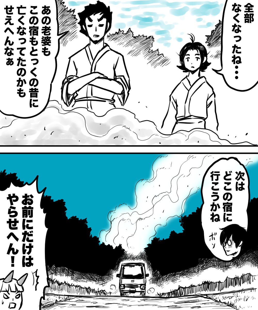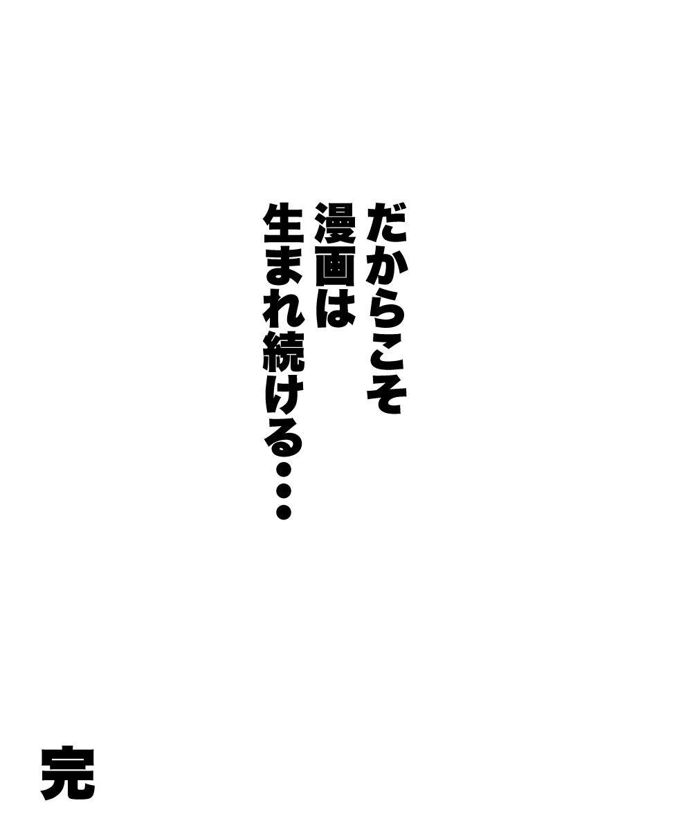 2024年01月27日 次々と漫画家が消えて行く宿43 最終回 これにて「次々と漫画家が消えて行く宿」は終わりになります。最後まで読んで下さって本当にありがとうございました。最初は4.5話ぐらいで終わるギャグホラーのつもりで描いてたのですが、もっと演出したいって付け足してったら、あれよあれよって間にこんなに長くなってしまいました😅しかも今まではエッセイ漫画だったのが、この作品は完全な創作です。いや〜楽しかった。ちなみに何度も言いますが、あくまで漫画家さんは僕の中でモデルのイメージがいますが、勝手なイメージですので(笑) タグ :#漫画が読めるハッシュタグ#漫画#マンガ#漫画家#漫画アシスタント#ミステリー#ホラー#謎#旅#創作 「漫画家が消えて行く宿」カテゴリの最新記事 < 前の記事次の記事 > コメント コメント一覧 しげ 2024年01月27日 18:57 完結おめでとうございます~。 次は奥さんとの日常モノですかね?そうだと嬉しいです。 ハルマキ 2024年01月27日 19:36 >>1 最後まで読んでくださりありがとうございました! なるほど!(笑)それもちょくちょく描きますね😆 しらはわたる 2024年01月27日 21:41 きれいな終わりかたでしたね! モデルの先生方が思い浮かぶんで、一粒で二度おいしいマンガでした✨ 必殺技は楽しかったです!! また次の作品を待ってます~ ハルマキ 2024年01月28日 03:07 >>3 わぁ〜しらはさん!最後まで読んでいただきありがとうございました! ワハハハ!おそらくイメージされてる方は一致してるかと(笑) はい!また読んでやって下さいね😆 名無し@j民 2024年01月28日 22:02 やばい建物壊す話、、、、、、、、、、?既視感が、、、、、、、、、、、? ハルマキ 2024年01月29日 04:36 >>5 まさか・・・まさかです😆 コメントフォーム 名前 コメント 記事の評価 リセット リセット 顔 星 情報を記憶 コメントを投稿する