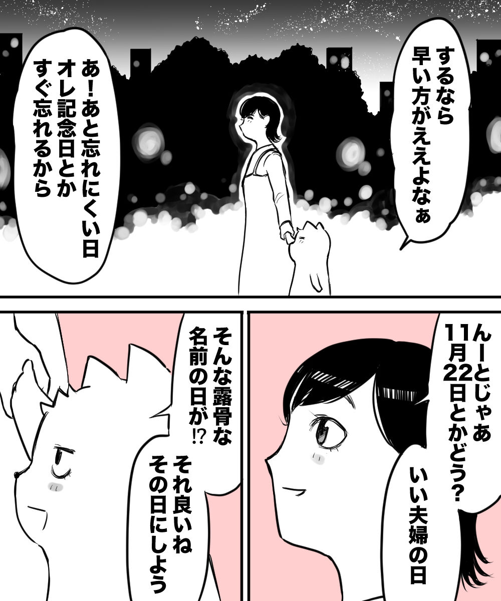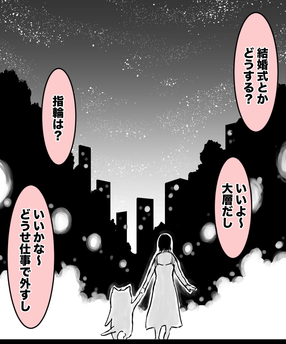 2024年12月14日 42歳無職が初彼女と結婚するまで22 最終話 この漫画の最終話を描いてるちょうどその時、結婚2周年を無事迎えることができました。振り返れば妻と初めて出会って半年も経たずにコロナが始まったので、もし時期がずれていたら当然お互いの職業もあるし恋活もやってないだろうとそう考えると、おそらく出会えてもなかったし結婚もしてなかったんだろうなって思えて感慨深いです。人と人との人生が交差するってそれぐらい偶然が重なって起こるんですね。では、ここまでお付き合い下さってありがとうございます。次の作品でお会いしましょう〜↓Kindleでもコチラの作品がまとめて読めますので一気読みしたい方はぜひ! タグ :#漫画#マンガ#恋活#婚活#恋愛#恋愛初心者#アラフォー独身男子#エッセイ漫画#結婚#最終回 「38才男恋活」カテゴリの最新記事 < 前の記事次の記事 > コメント コメント一覧 しげ 2024年12月14日 17:54 もう食ったさ…ハラァいっぱいだ…って気分です。 こんな幸せな話を読まされたらとらもヒョウさんも流兄ちゃんも成仏しちゃいますよ。次の漫画も楽しみにしてます!! ハルマキ 2024年12月14日 18:04 >>1そんな大名作と比べられると恐縮ですが💦 最後まで読んで楽しんでもらえたのなら嬉しいです。 本当ありがとうございました! トナカイ 2024年12月14日 21:11 感無量です。 まき 2024年12月14日 21:11 良き❤️ ハルマキ 2024年12月14日 22:53 >>3 良かったです!最後まで読んで下さってありがとうございました。 ハルマキ 2024年12月14日 22:53 >>4 良かった〜ありがとうございました! tt 2024年12月15日 22:32 ハルマキさん、応援してま~す ハルマキ 2024年12月15日 22:41 >>7 わぁ〜嬉しい!😭 ありがとうございます!頑張ります! 殺し屋シリーズ隠れファン 2024年12月16日 22:06 素敵な漫画ありがとうございました! 漫画もですが最後のハルマキさんのコメントにジーンとしました 人との縁を大切にするハルマキさんだからこそ掴めた幸せなんだなと思います 2周年おめでとうございます! ハルマキ 2024年12月17日 15:48 >>9 こちらこそ最後まで読んで下さってありがとうございました! 恋活やって多くの人に出会って、縁ってのがさまざまな偶然が重なって出来てるもんだなって感じたので。 殺し屋シリーズもそのうち続き描きたいですね(笑) コメントフォーム 名前 コメント 記事の評価 リセット リセット 顔 星 情報を記憶 コメントを投稿する